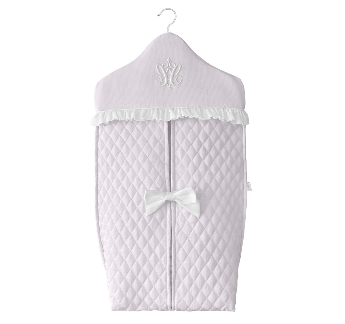 Practical diaper organizer made of quilted cotton in a baby pink colour. Decorated with a frill and lovely bow fastening. It has a hanger that allows you to hang it on a bed, chest of drawers, or wardrobe door.
