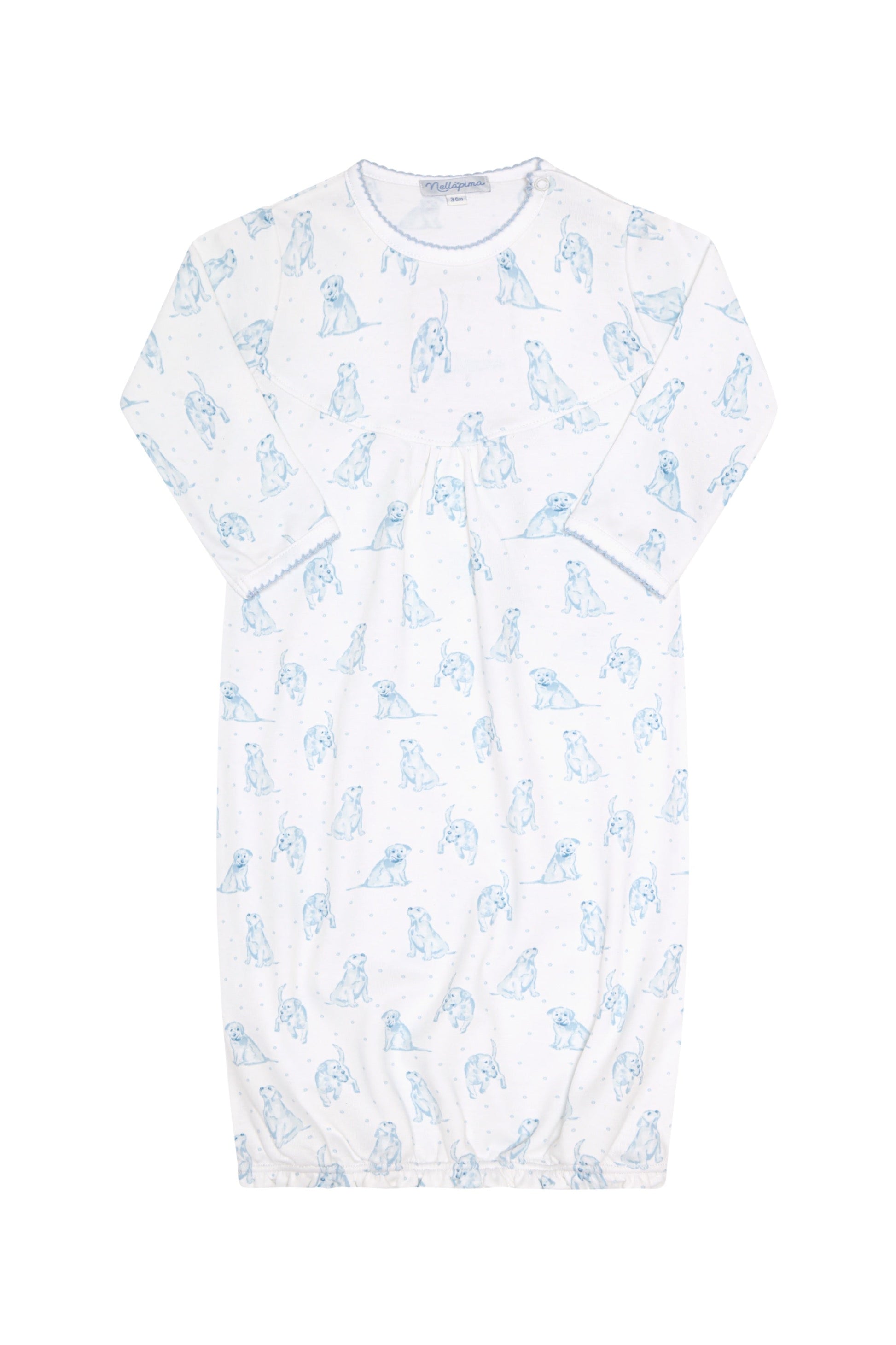 Soft, breathable, and elegant — this Pima cotton gown is designed with newborn comfort in mind. The elastic bottom allows for hassle-free diaper changes, while the envelope neckline offers easy dressing. With its gentle blue puppy print and meticulous finish, this gown is ideal for restful nights and memorable first moments.