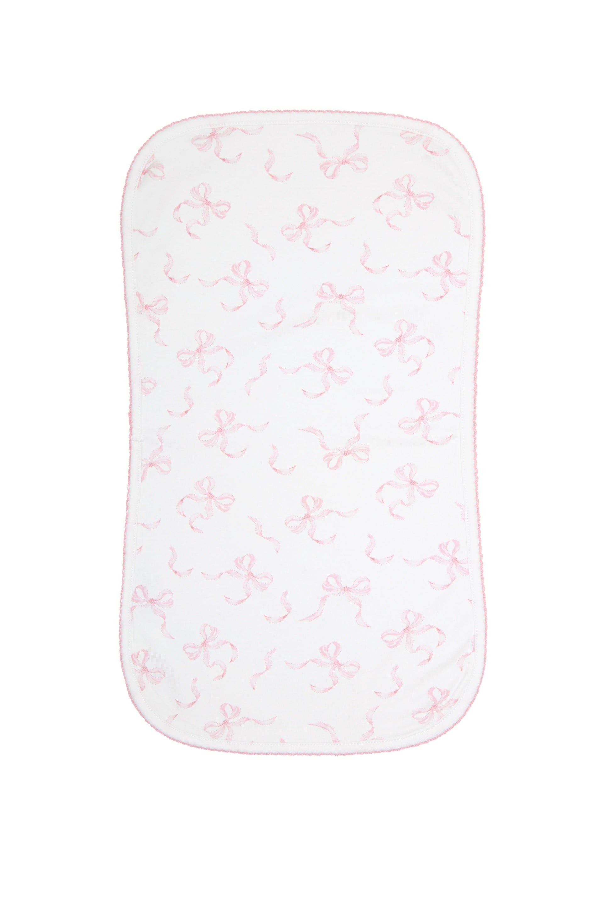 Functional meets beautiful in this elegant burp cloth, designed to keep both baby and parent clean in style. Made from ultra-soft Peruvian Pima cotton with an extra-absorbent backing, it features our delicate Charming Bows print throughout. Generously sized, it provides excellent shoulder coverage for parents during feeding or burping. A must-have for the diaper bag, nursery, or as a thoughtful baby shower gift.