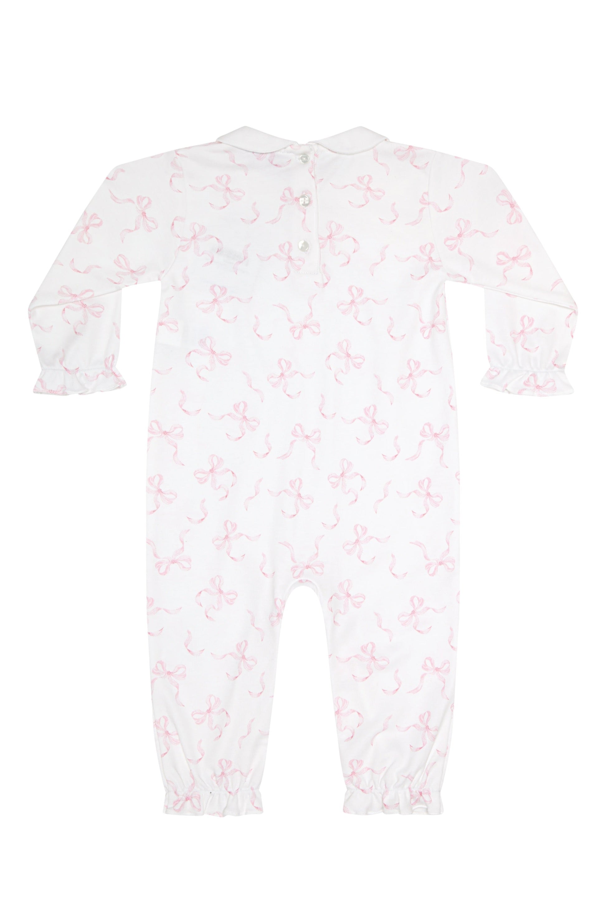 This long-sleeve romper is a cozy essential for cooler days. Thoughtfully designed with snap closures for easy diaper changes, it’s made from breathable Peruvian Pima cotton and covered in our soft Charming Bows print. Perfect for lounging, tummy time, or sweet strolls outdoors.