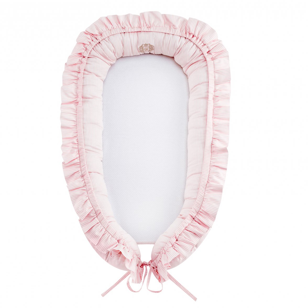 An elegant and functional baby cocoon. Its outer part is made of high quality pink-striped cotton. Its inner part is made of white soft textile. The cocoon makes your baby feel calm and safe. It may be used in parent's bed, on the floor or on the couch. Perfect for children aged up to 6 month.