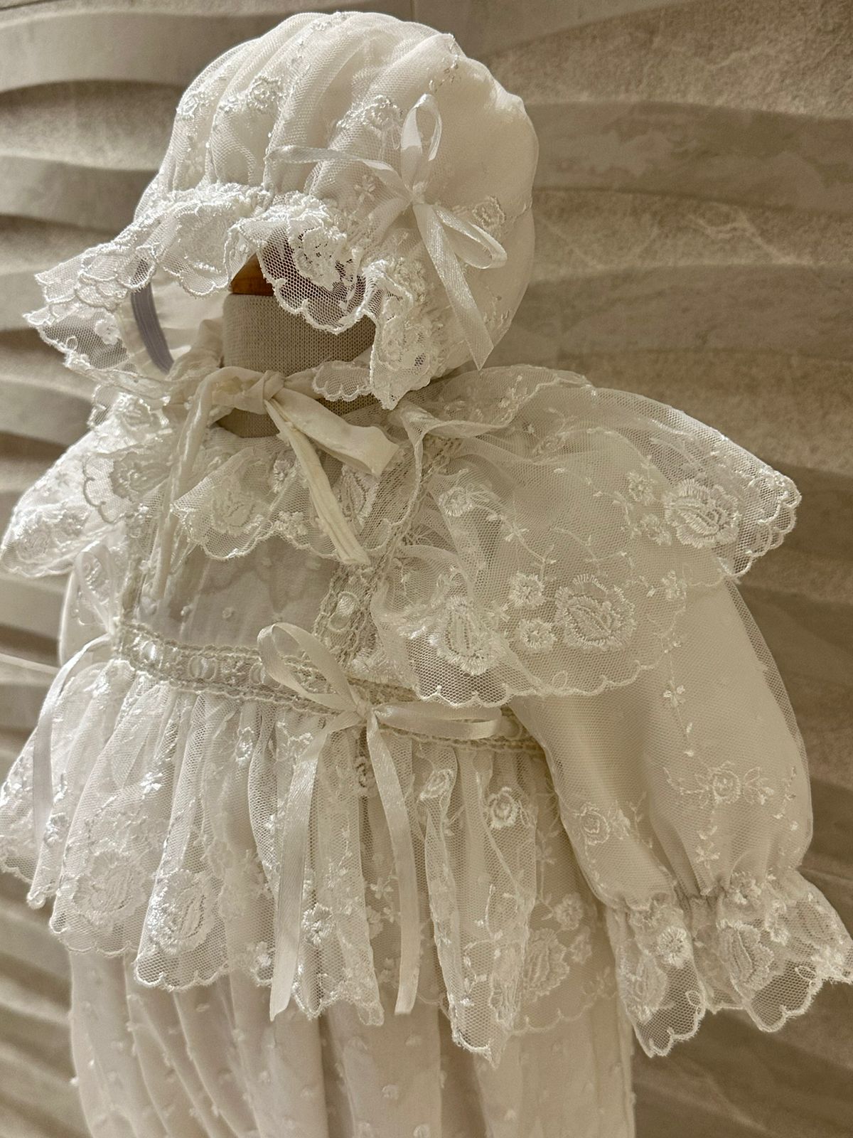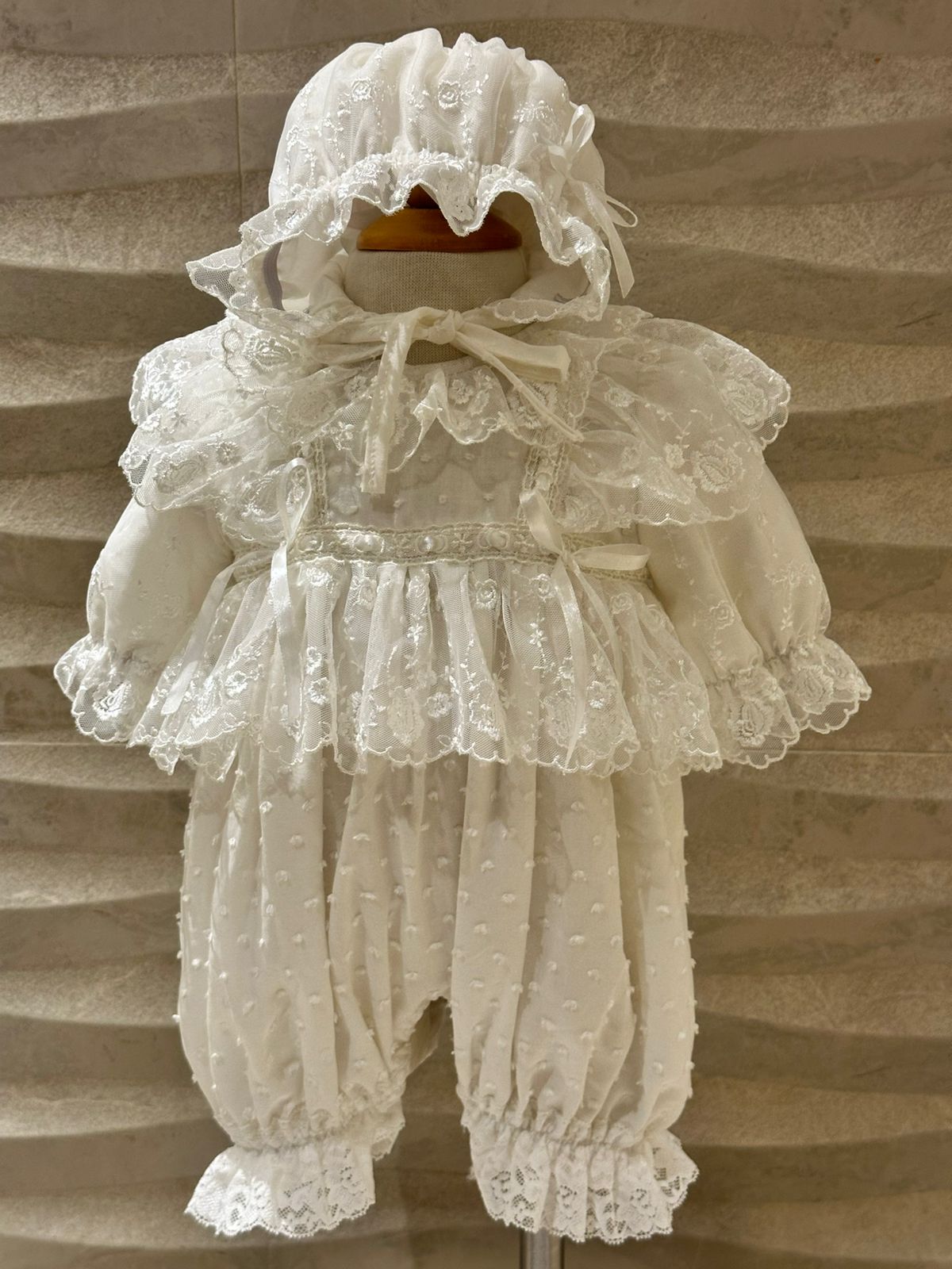 Delicate ivory lace crafted with meticulous attention to detail creates an heirloom-quality romper perfect for special occasions. Each piece is handmade to ensure exceptional quality and timeless elegance. The soft, breathable fabric provides comfort for your little one, while the refined lace detailing adds a touch of understated luxury. Ideal for christenings, celebrations, or creating cherished memories.