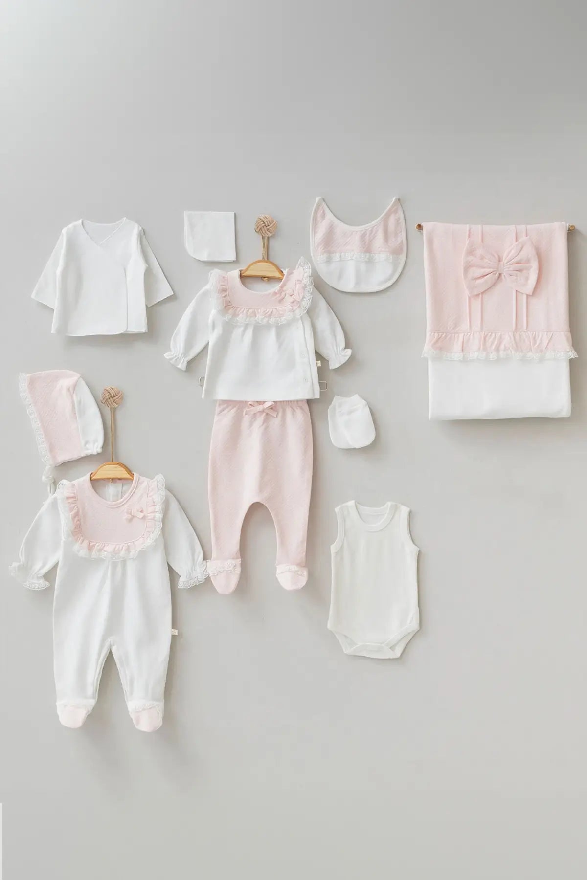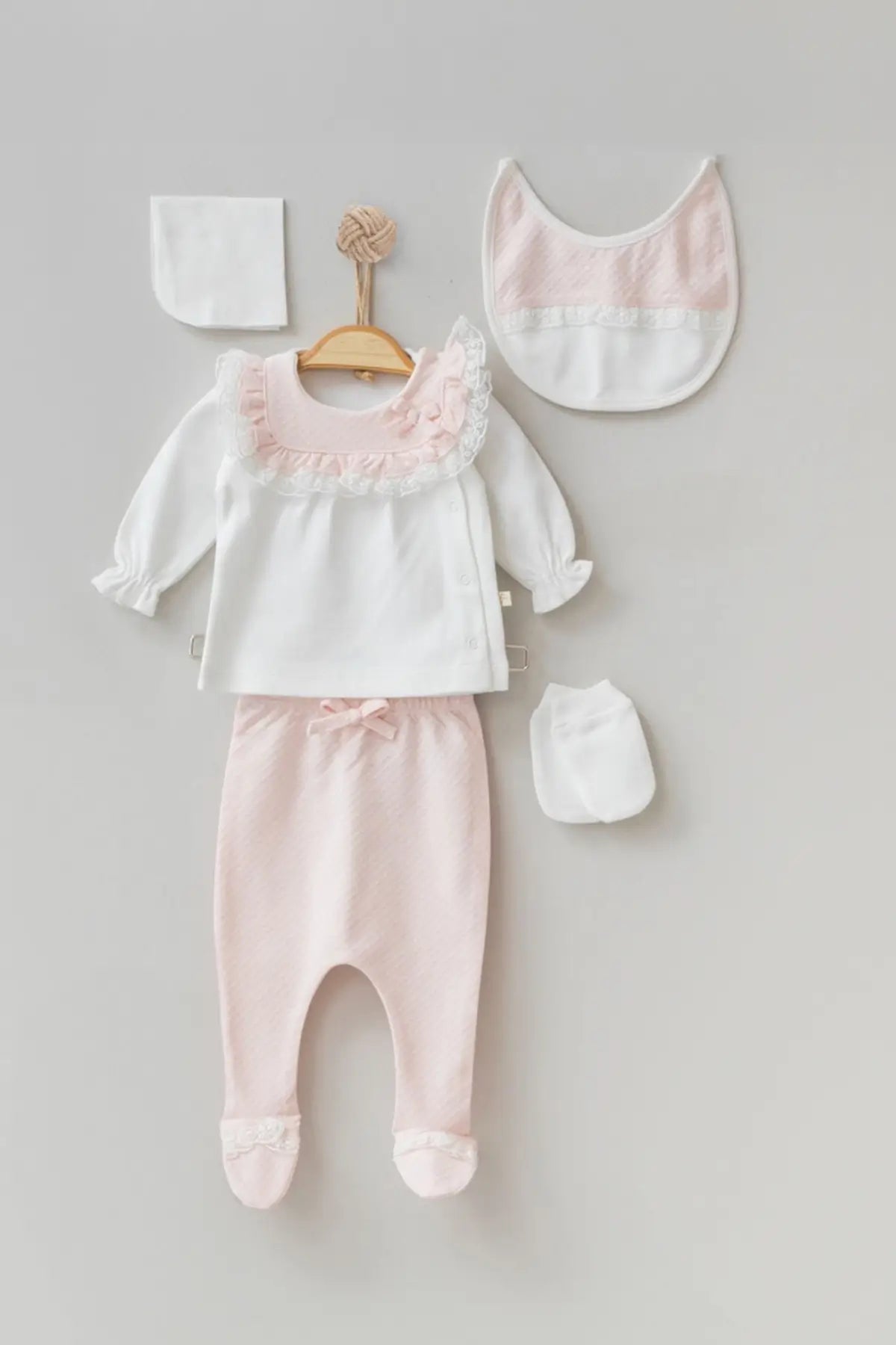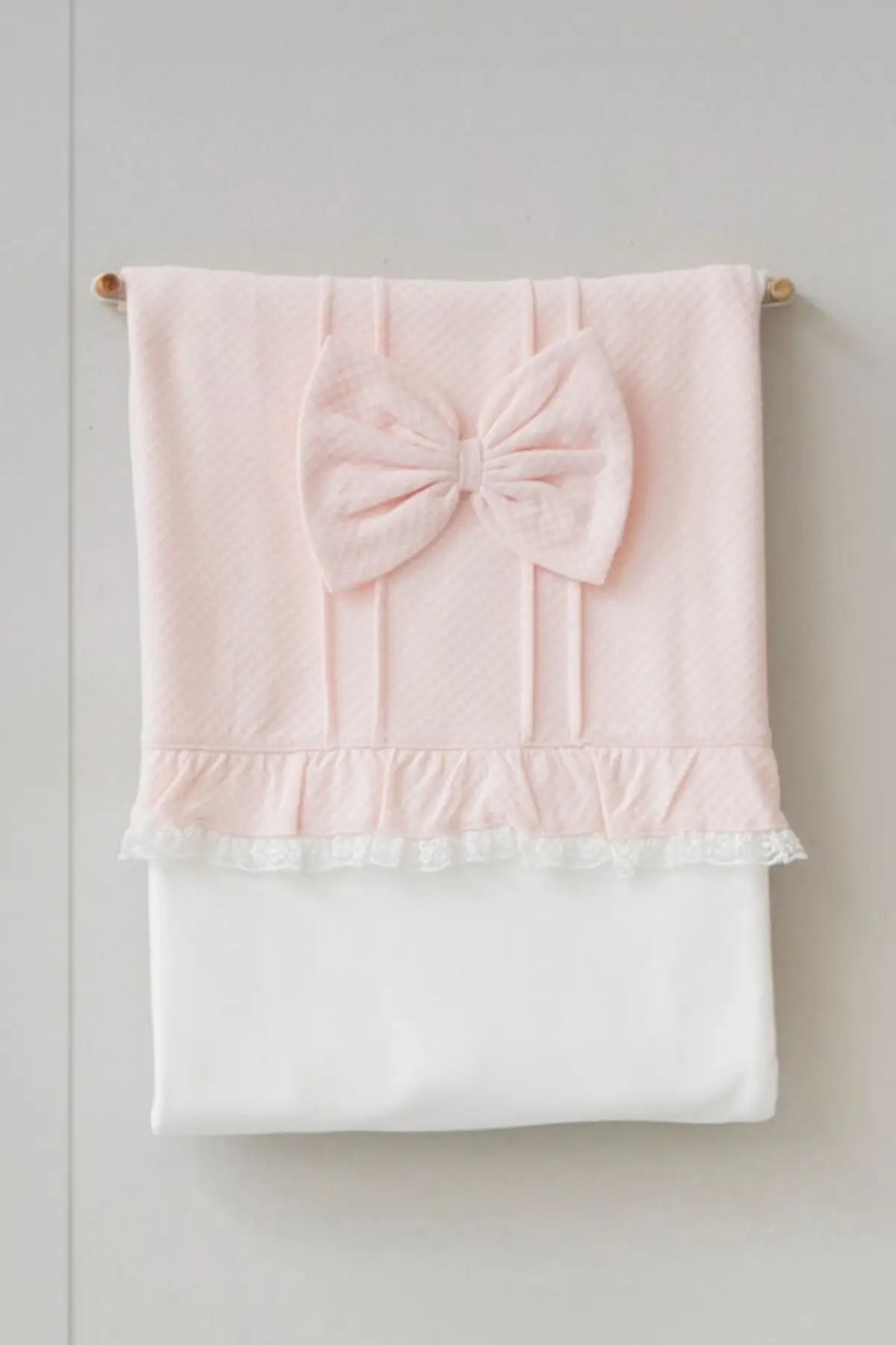 - Blanket: The blanket features a beautiful, dominant pink color, adorned with a delicate pink bow and a lacy white trim. Crafted from 100% cotton, it wraps your newborn in the coziness they deserve.